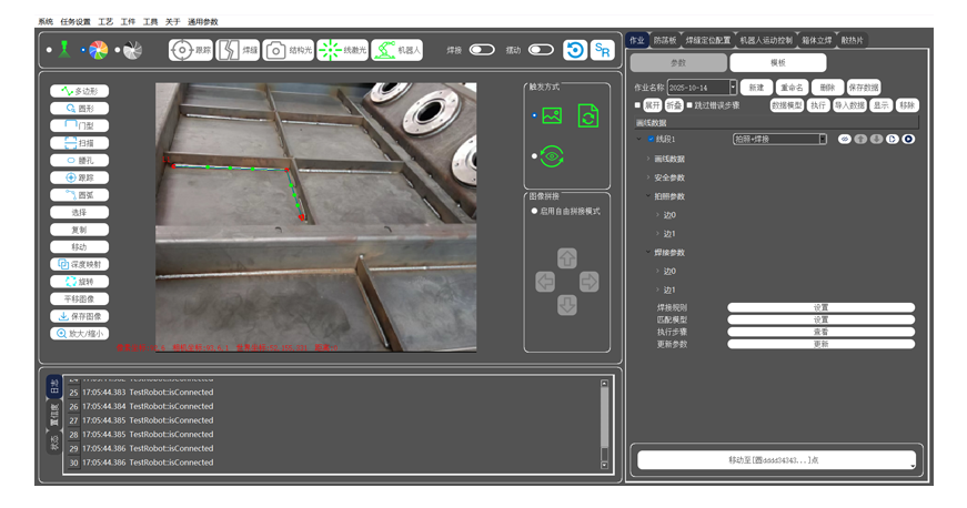 实时焊缝识别及定位:依据选定的焊缝类 型,实时对工作场景中出现的焊缝进行识别, 并输出焊缝在相机坐标系内的坐标(X, Z)。